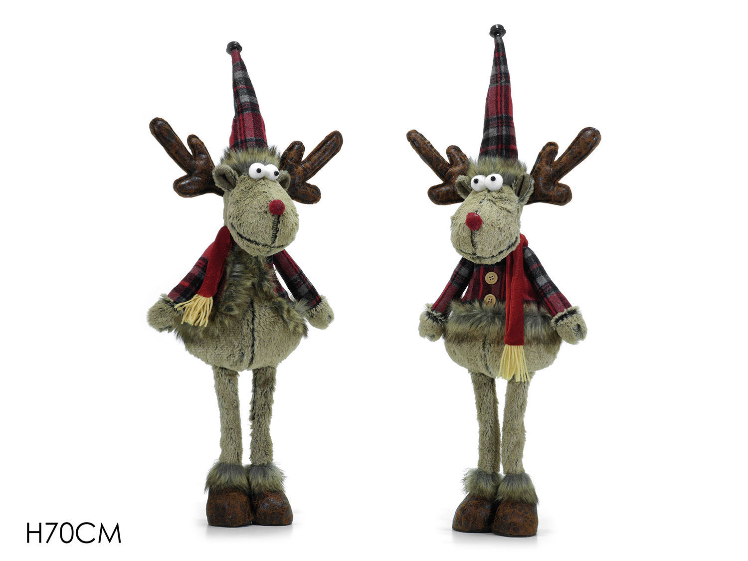 Renna natalizia in piedi alta 70 cm, realizzata in stoffa con cappello lungo e sciarpa. Vendita singola con soggetto assortito spedito in base alla disponibilità.