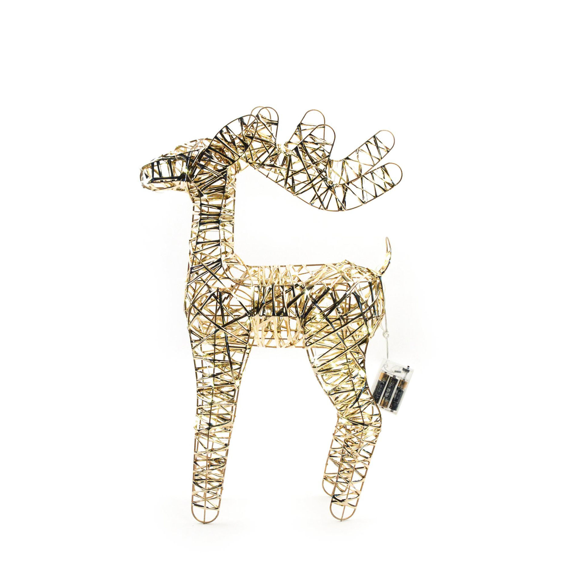 Renna oro in metallo con 100 luci LED a batteria, dimensioni 39x14xH60 cm, elegante decorazione natalizia luminosa per interni ed esterni coperti.