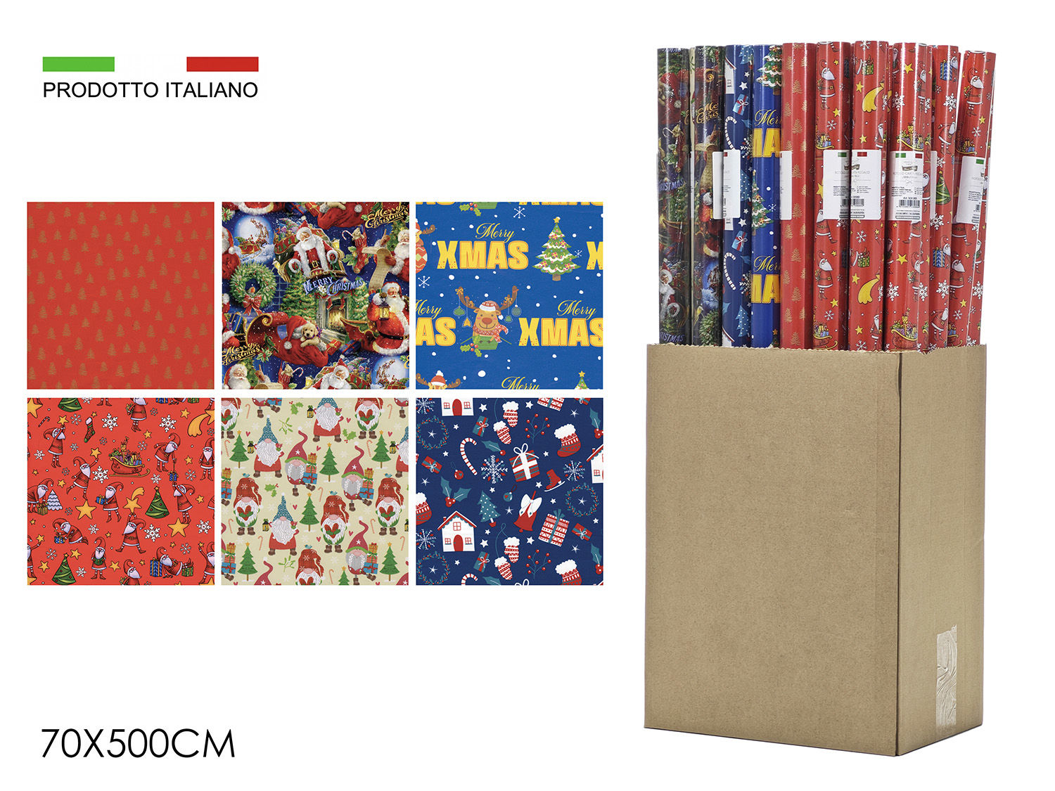 Rotolo di carta regalo natalizia 70 x 500 cm con fantasie assortite, ideale per confezioni regalo abbondanti e allestimenti professionali.