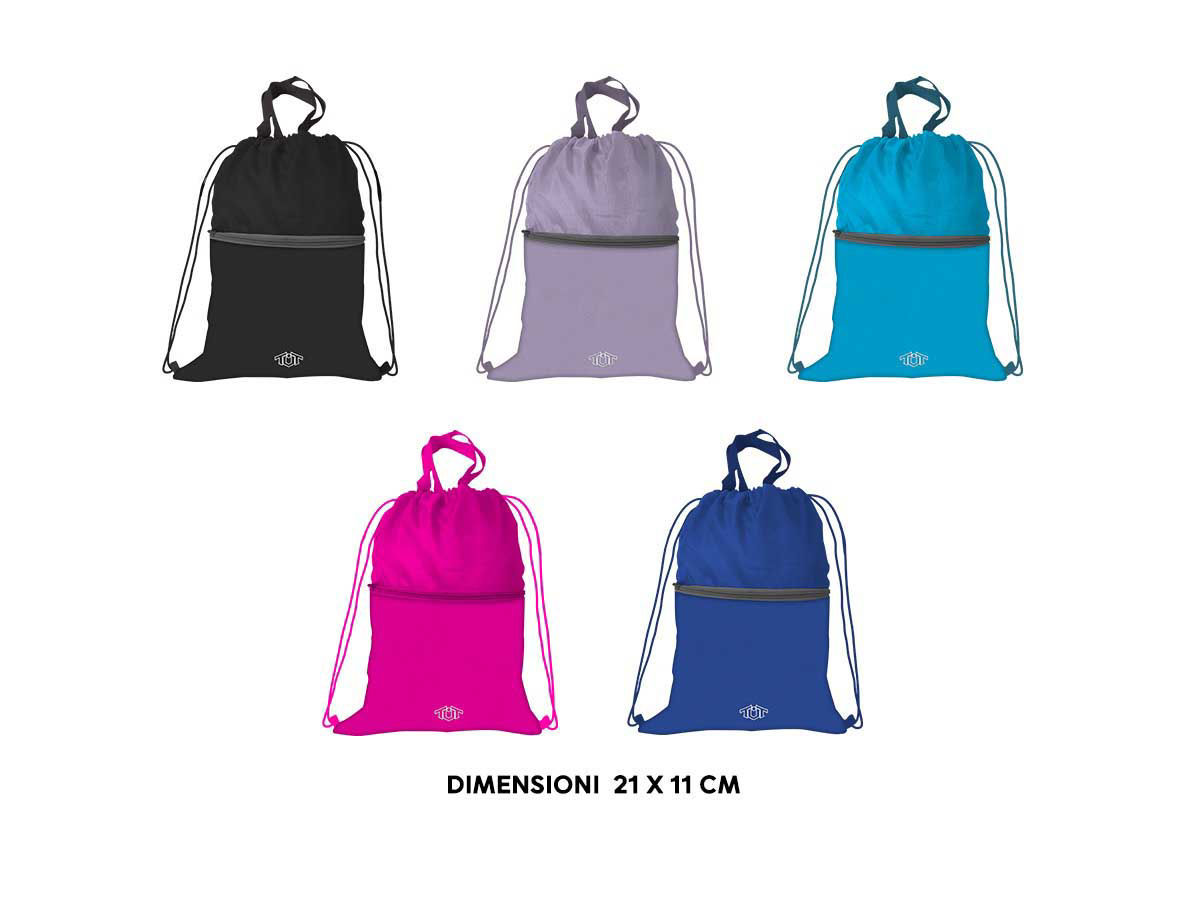 Sacca sportiva monocolore 44x33 cm con tasca frontale: leggera, resistente e pratica per scuola, palestra e tempo libero.