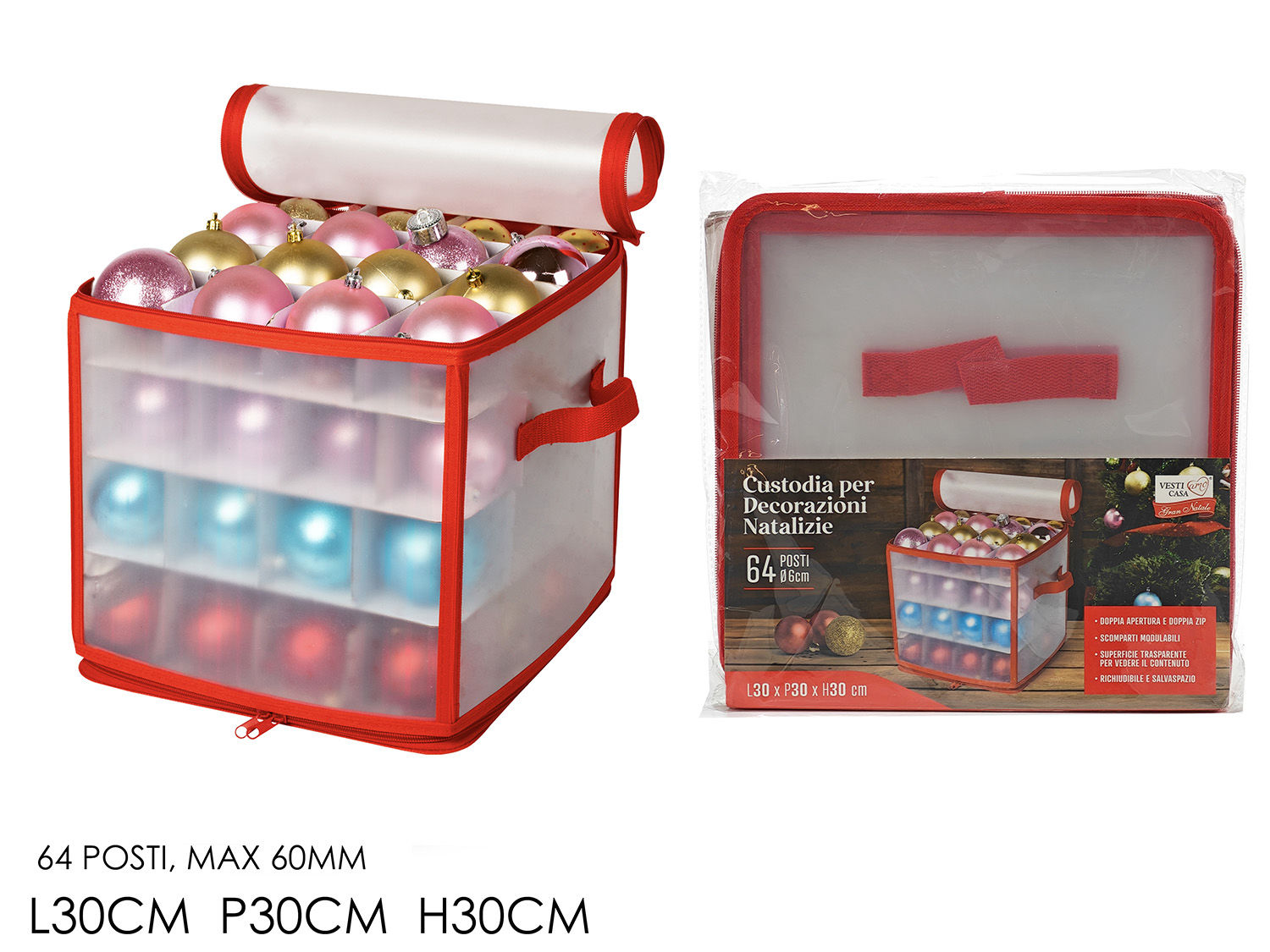 Scatola porta decorazioni natalizie da 64 posti, capienza massima 60 mm. Custodia resistente, pieghevole e salvaspazio per palline e addobbi. Misure 30x30x30 cm.