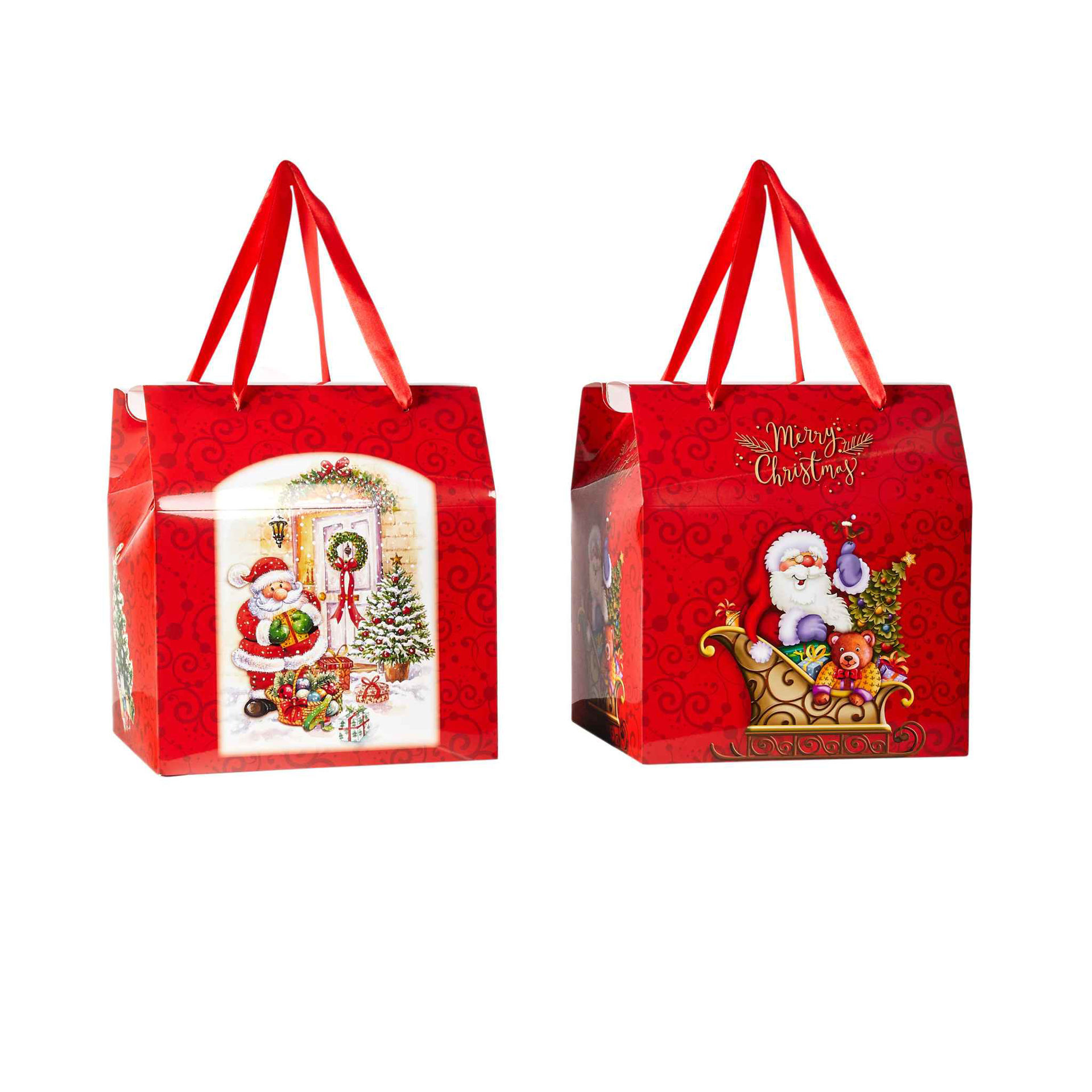 Scatola natalizia per torte in carta, capienza massima 1 kg, dimensioni 27x27xH.31 cm, con manici in tessuto rosso. Design assortiti.