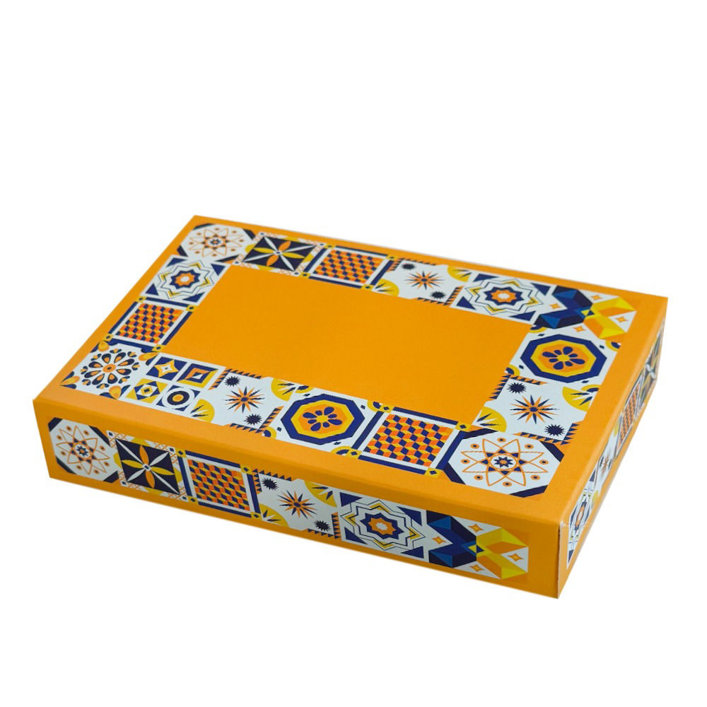 Scatola per dolci automontante con fantasia piastrelle modern, realizzata in cartone resistente e idonea al contatto alimentare.