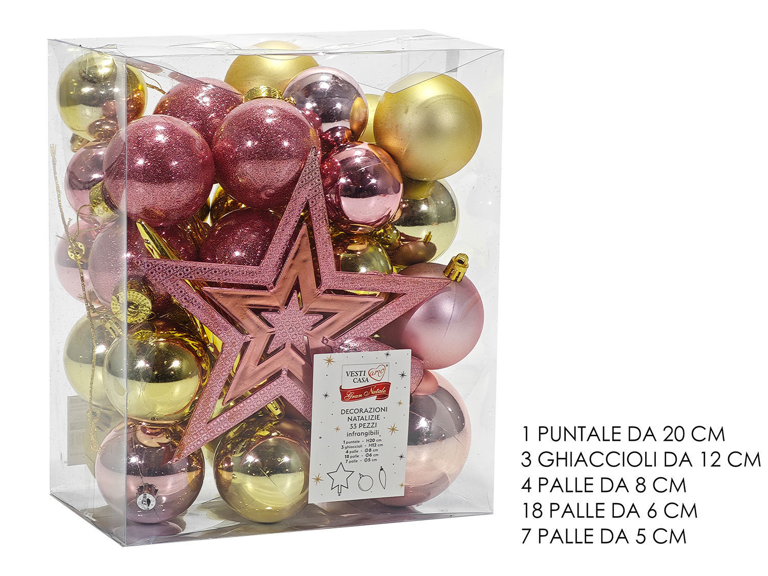 Set natalizio da 33 pezzi in oro e rosa con palline, ghiaccioli e puntale coordinato.