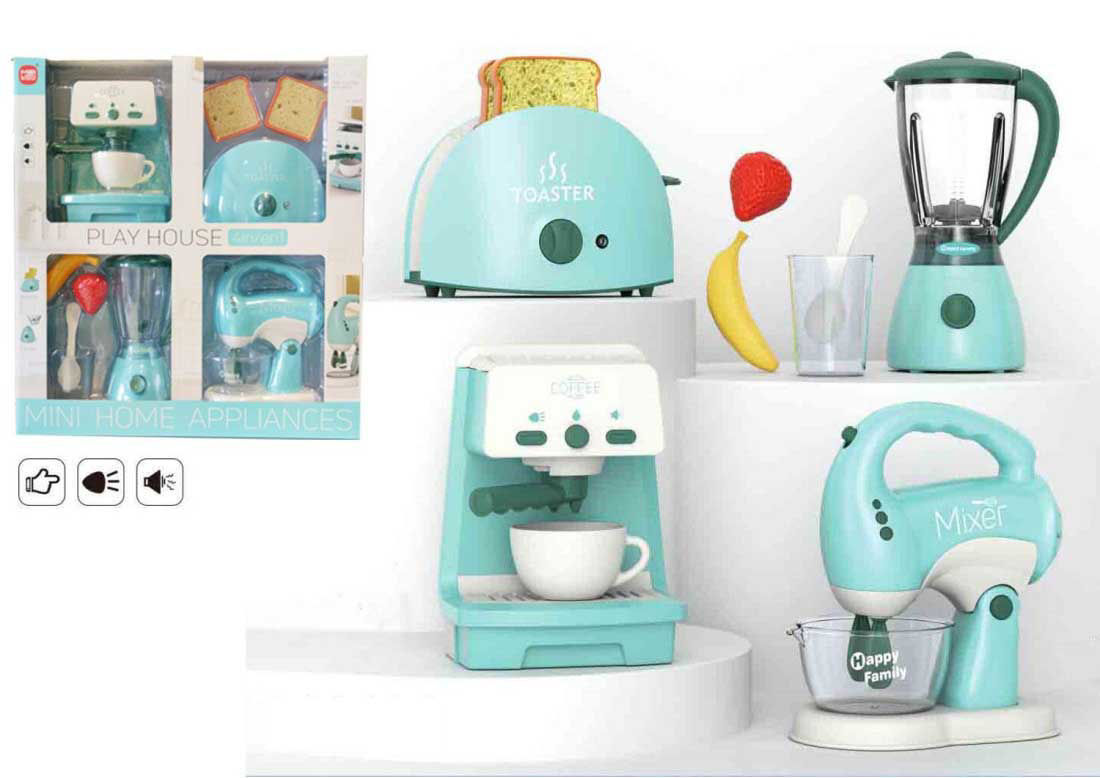 Set di quattro elettrodomestici giocattolo con funzioni reali che permettono ai bambini di imitare le attività quotidiane della cucina in modo realistico e divertente.