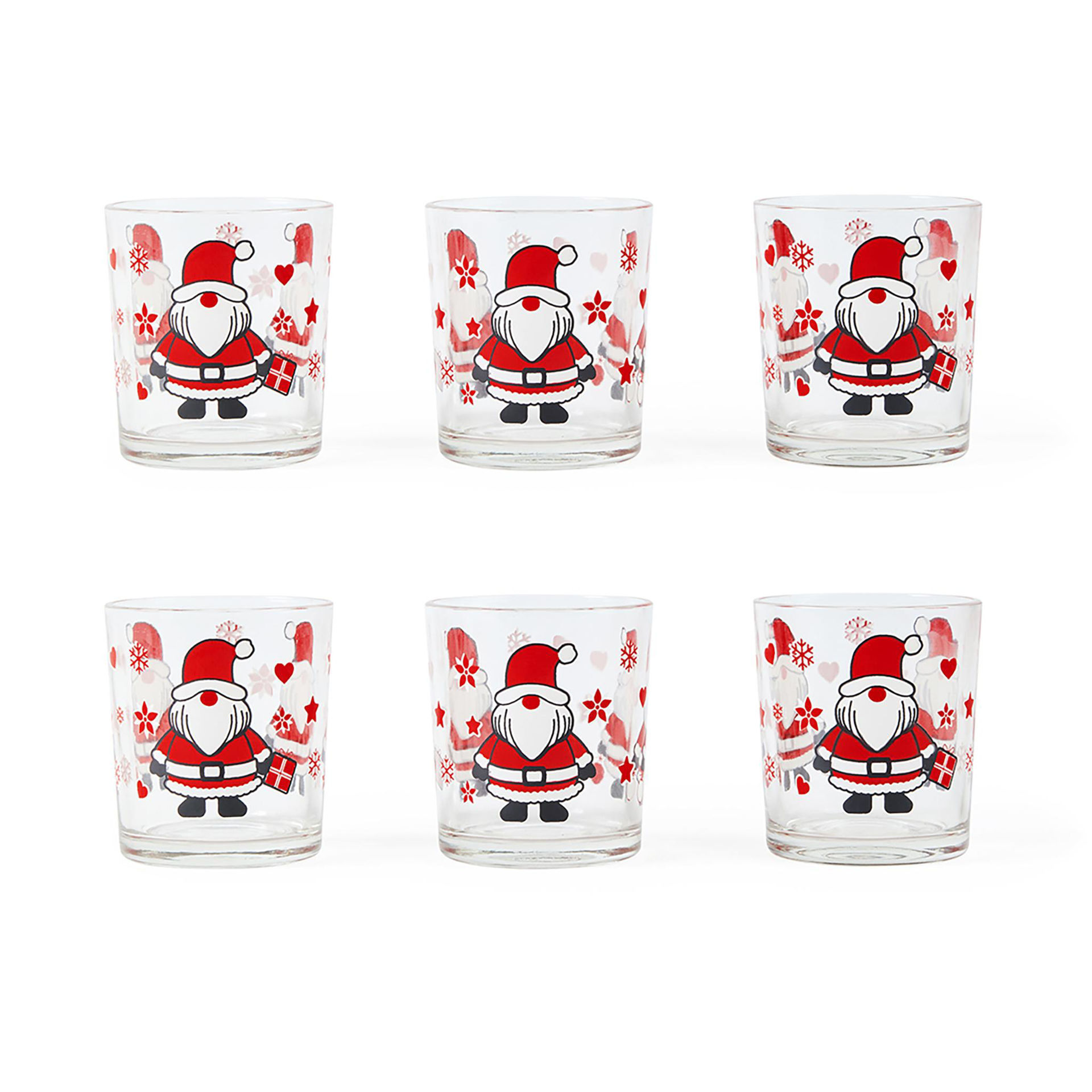 Set da 6 bicchieri in vetro da 265 ml decorati con Babbo Natale. Perfetti per arricchire la tavola delle feste con allegria e colore.