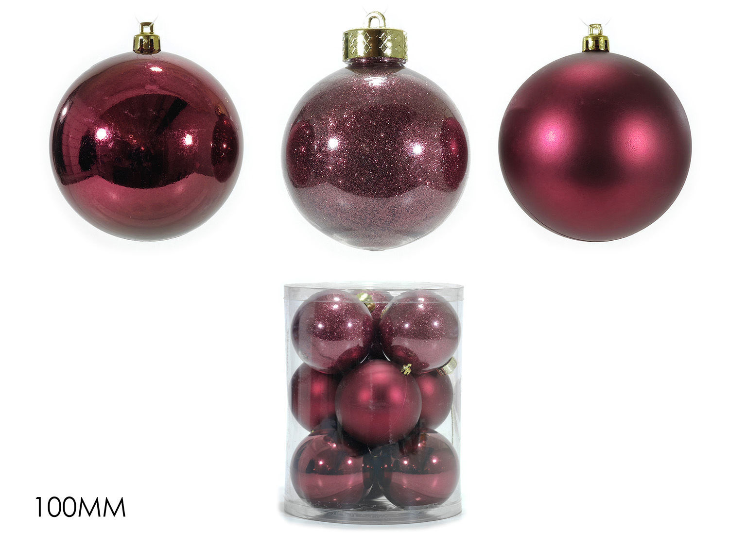 Set di 9 palle di Natale bordeaux da 100 mm in finitura lucida, opaca e glitter. Decorazioni natalizie eleganti per albero e addobbi.