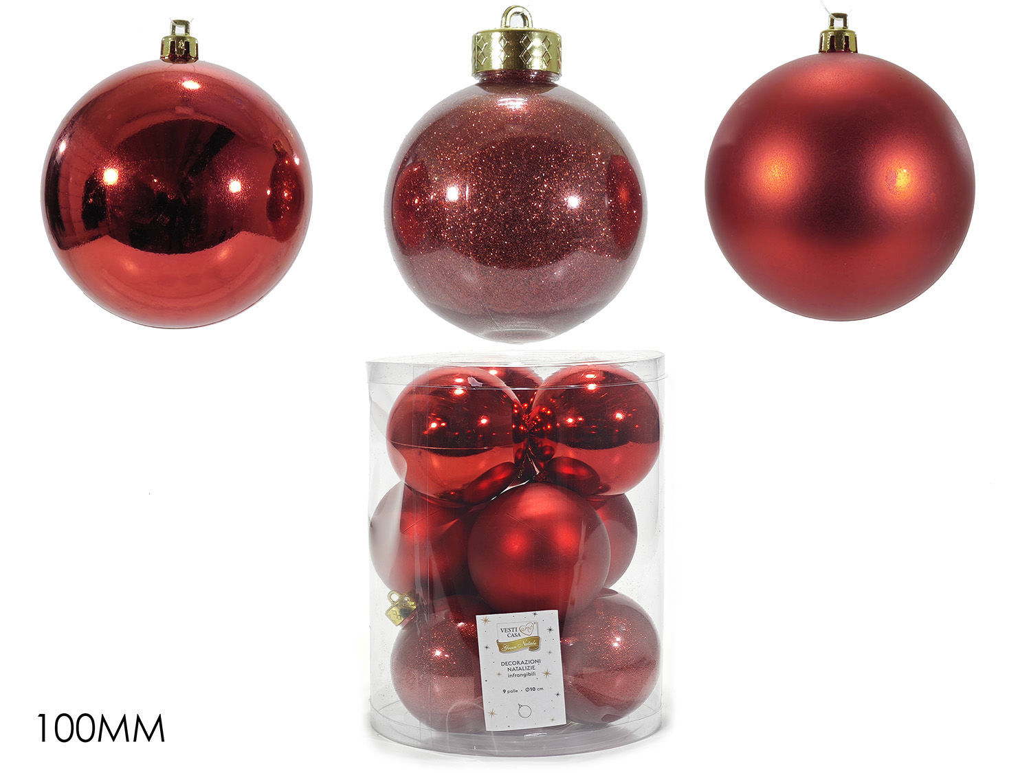 Set di 9 palle di Natale rosse da 100mm in finitura lucida, opaca e glitter. Decorazioni natalizie classiche ed eleganti per alberi grandi e addobbi.