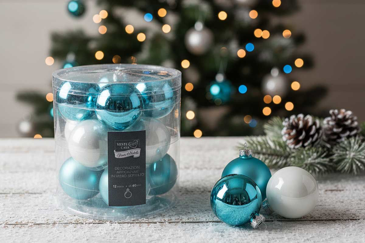 Palle natalizie in vetro color turchese, disponibili in diversi diametri e quantità. Ideali per decorare l’albero di Natale con uno stile fresco, moderno ed elegante. Varie dimensioni