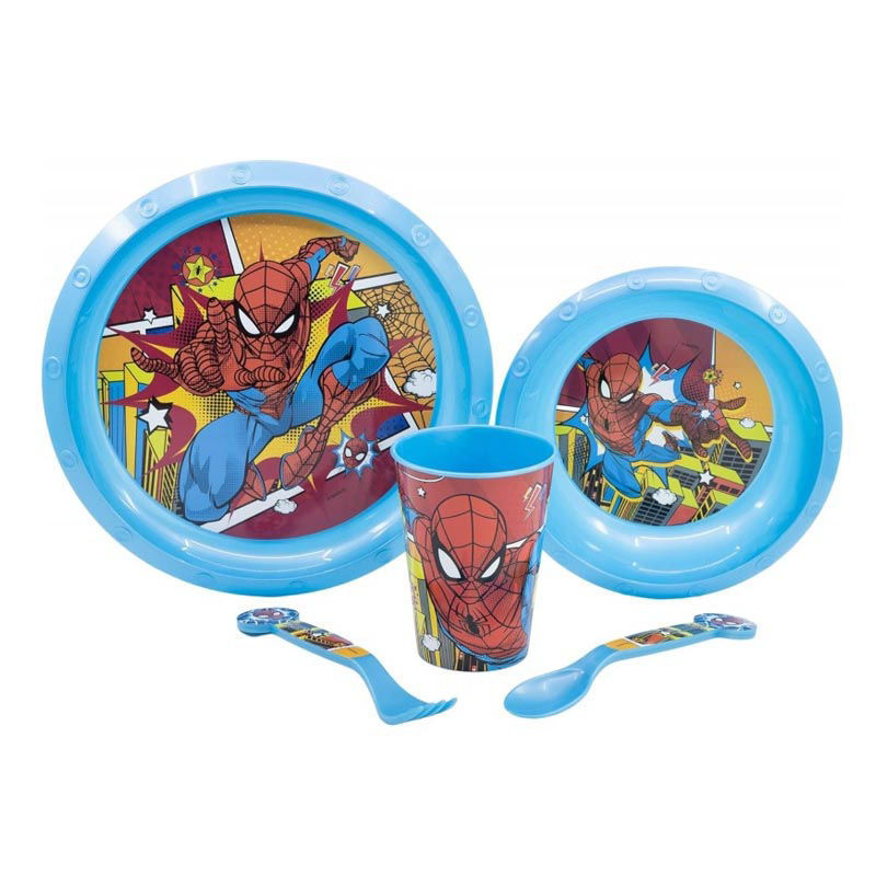 Set pappa 5 pezzi Spiderman con piatto, fondina, bicchiere, forchetta e cucchiaio. Perfetto per i pasti dei bambini.