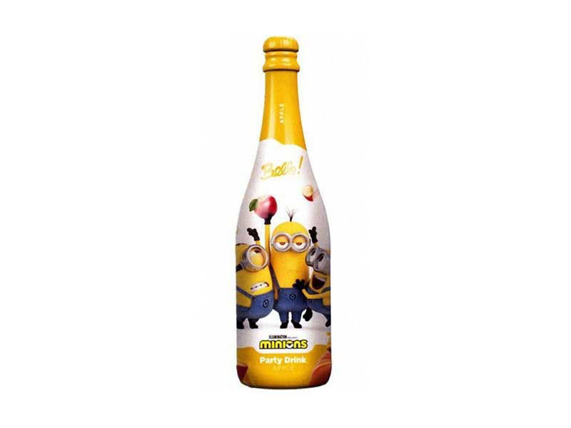 Spumante analcolico Minions per bambini, bottiglia da 750 ml, party drink frizzante al gusto di mela. Ideale per feste e compleanni a tema.