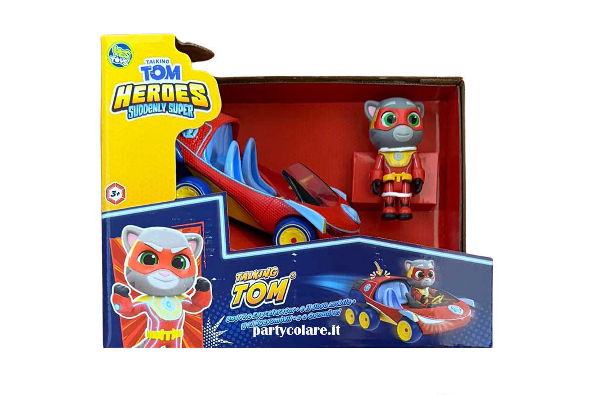 Set SuperAmici con Talking Tom e veicolo con luci e suoni, perfetto per vivere avventure eroiche ispirate alla serie Talking Tom Heroes.