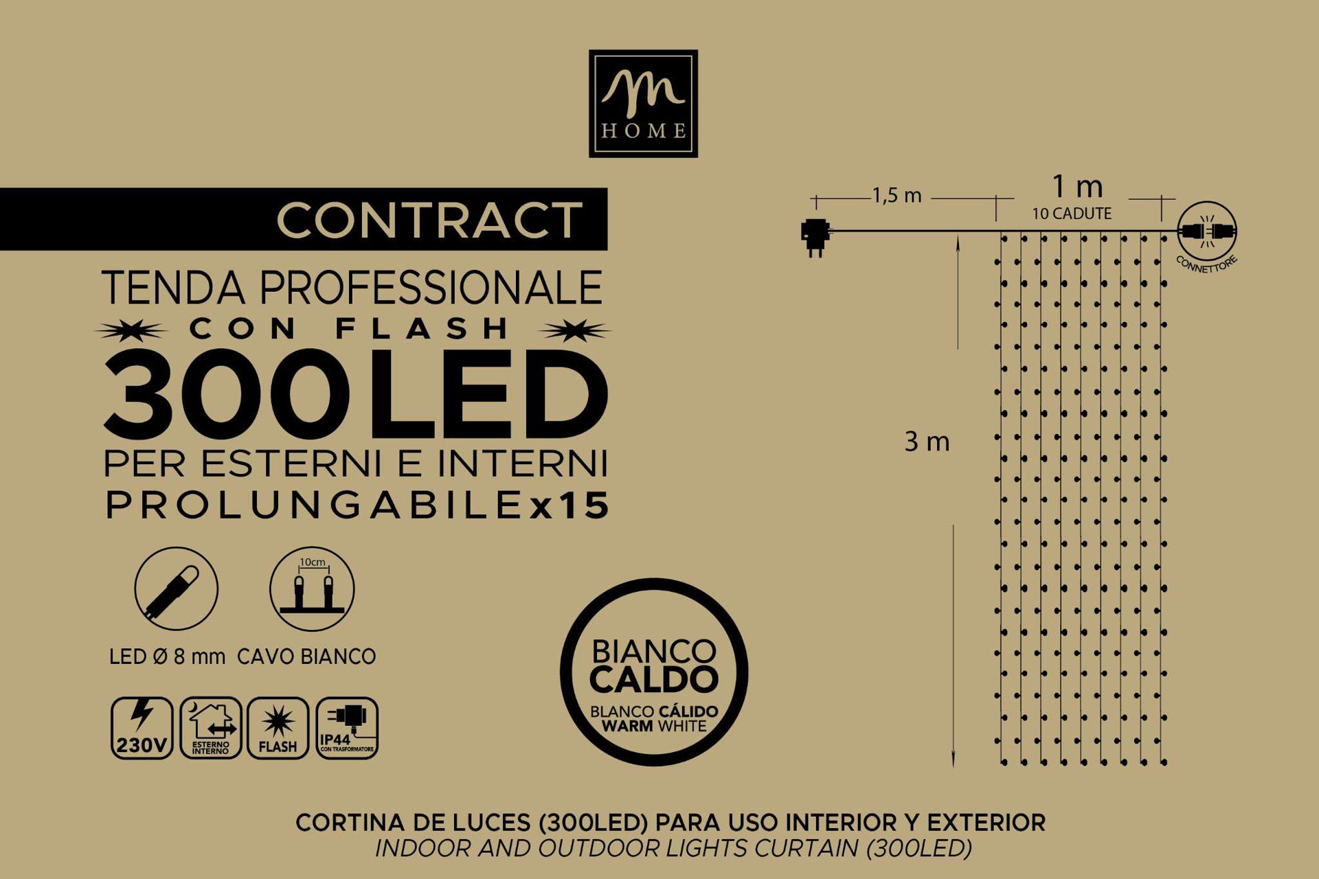 Tenda luminosa professionale 300 LED bianco caldo con flash, dimensioni 1x3 metri, per uso interno ed esterno. Prolungabile fino a 15 moduli, alimentazione 230V, consumo 15.5W.