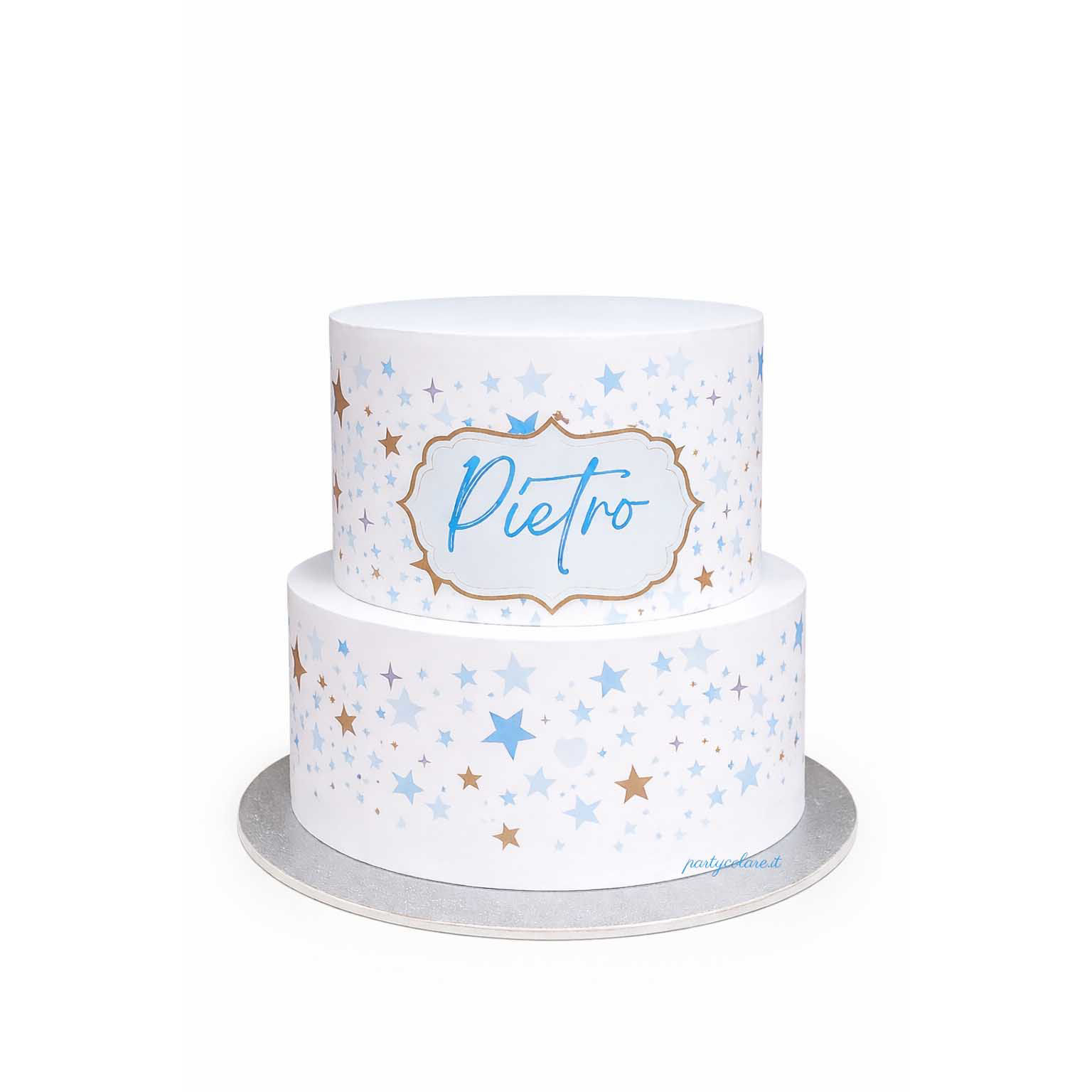 Torta in polistirolo personalizzata Partycolare a 2 piani con fasce in carta stampata, ideale per allestimenti di eventi, vetrine e scenografie.