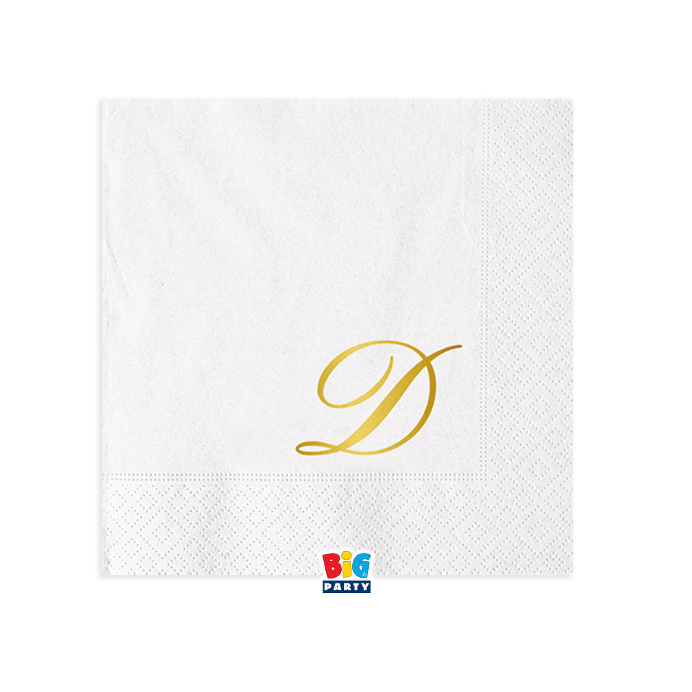 Tovaglioli 25x25 cm Lettera D 16 pezzi è una confezione di tovaglioli 2 veli firmati Big Party. Ogni tovagliolo misura 12,5x12,5 cm da chiuso (25x25 cm da aperto) ed è impreziosito da una lettera dell'alfabeto stampata a caldo in color oro. Perfetti per decorare la tavola in occasioni speciali come battesimi, compleanni, comunioni, matrimoni o eventi eleganti. Aggiungono un tocco raffinato e personalizzato a ogni festa.