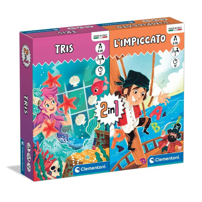 Clementoni 2 in 1 Tris + Impiccato, due giochi classici in un’unica confezione, ideali per sfide di logica e intuito per tutta la famiglia.