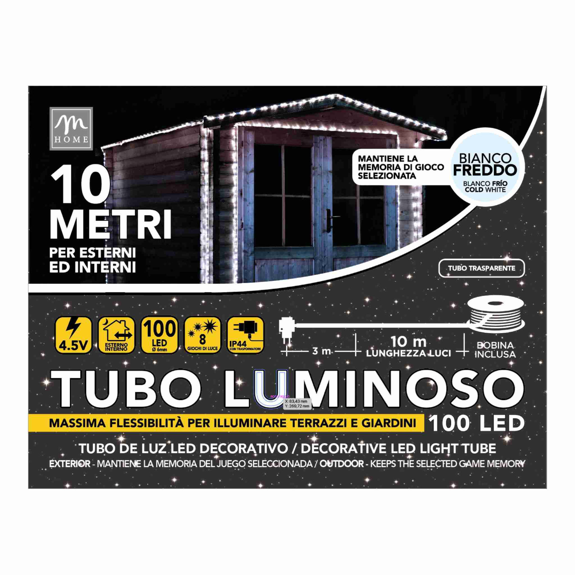 Tubo luminoso LED bianco freddo da 10 metri con 100 LED, ideale per decorazioni interne ed esterne. Resistente e flessibile, perfetto per Natale e ambienti moderni.