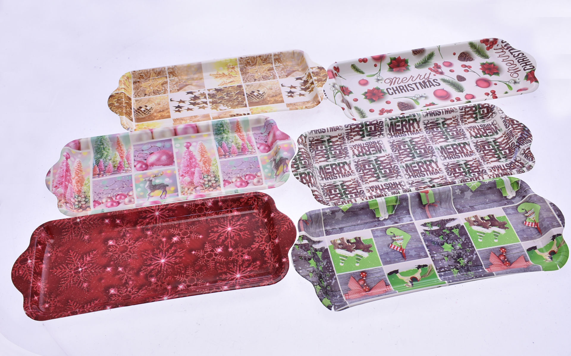 Vassoio natalizio in melamina da 39x17 cm con grafiche assortite, leggero, resistente e perfetto per servire dolci, snack e bevande durante le festività.