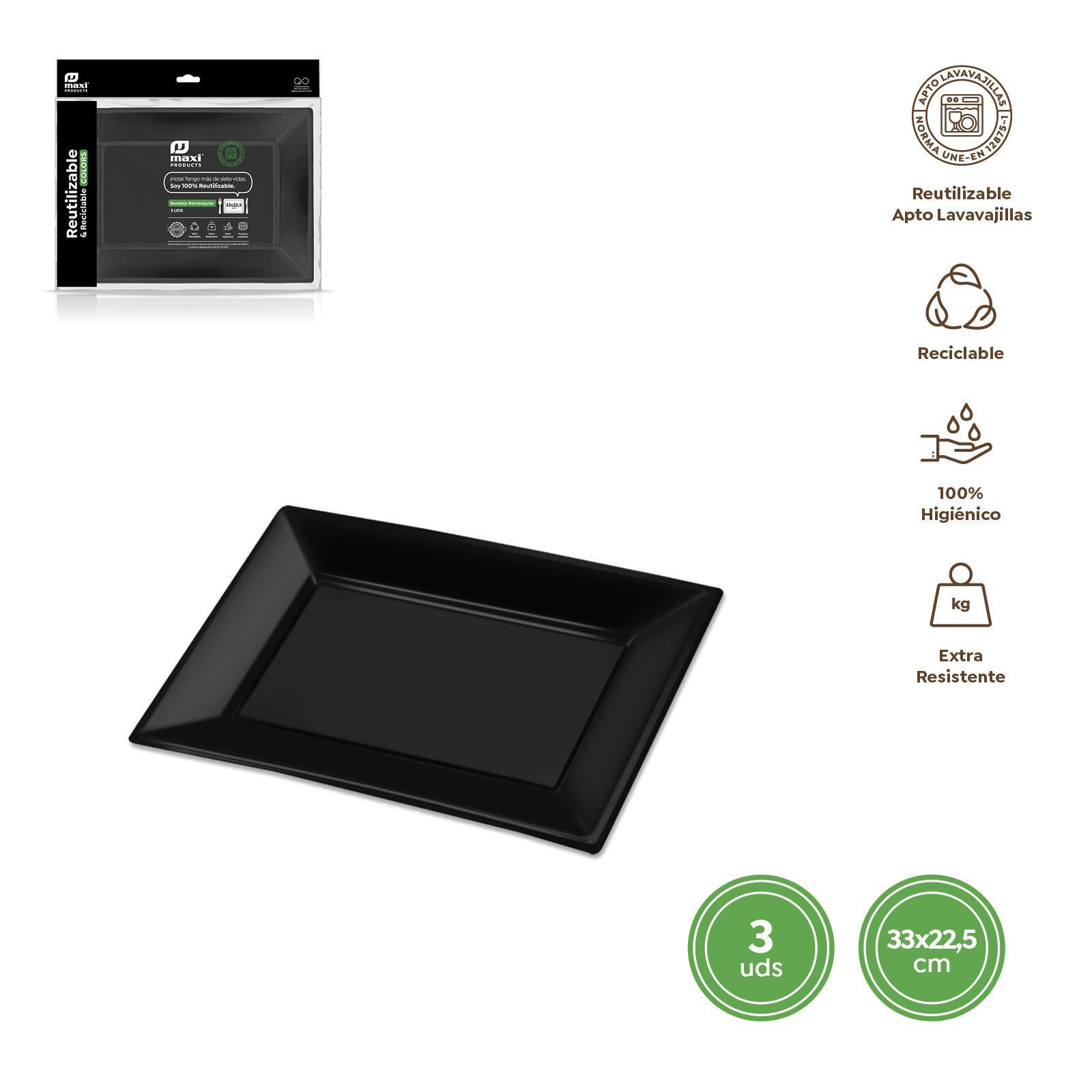 Vassoi rettangolari riutilizzabili neri da 33×22,5 cm in polistirene resistente, ideali per buffet, feste ed eventi. Pratici ed eleganti, perfetti per servire dolci e stuzzichini. Confezione da 3 pezzi.