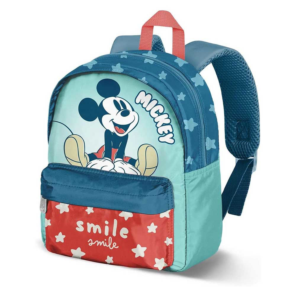 Decorato con un'espressione allegra di Mickey Mouse seduto su uno sfondo stellato e una tasca rossa con scritta "smile", questo zainetto è l’ideale per accompagnare i più piccoli all’asilo o durante il tempo libero.